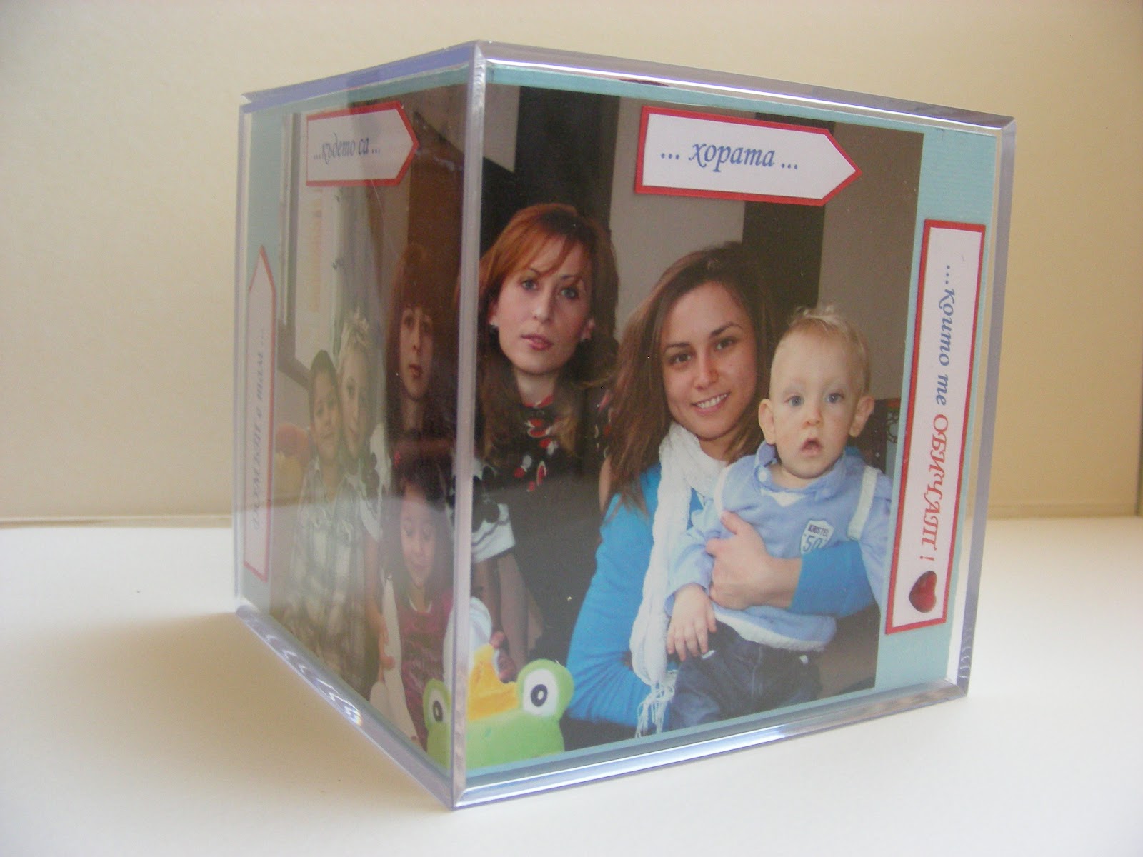 Това е една нестандартна рамка за 6 снимки. Пластмасов куб, който се отваря и във вътрешността му се поставят снимките. Видях я случайно в един магазин и моментално се влюбих в идеята. Изкупих ги всичките, за съжаление само 3 :-(